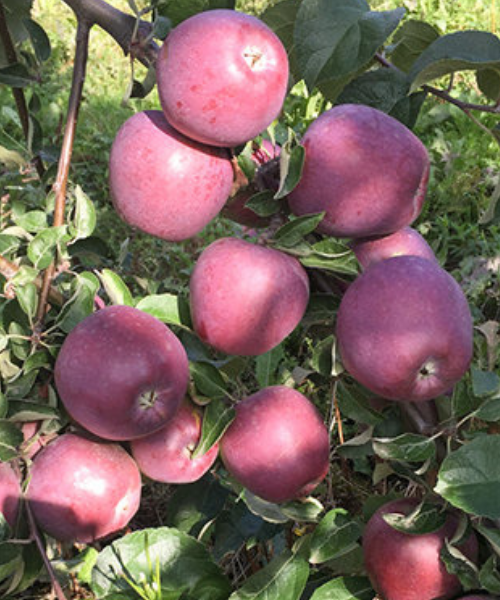 Late winter variety. Fruits are large, conical, ribbed, dark red with blue frosting. Flesh is crisp, sweet and sour. The tree forms a tall, rounded crown. Apples are picked late – in early October, can be stored until April. The variety is immune to scab. Good winter hardiness.