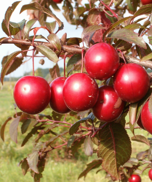 The tree is fairly large with a dense crown. Shoots, leaves, and fruits are dark red, and the flowers are pink. Resistant to fungal diseases and pests. Fruits are slightly flattened with red flesh. Pollinated by Caucasian plum. It also pollinates very early-flowering varieties.Notable as an ornamental variety.