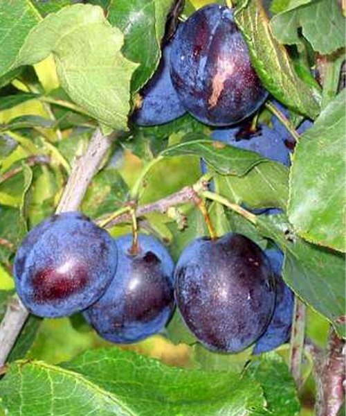 The tree is medium-height with a narrow, pyramidal crown. Flowers early. Fruits ripen early – in the first decade/midAugust. The fruits are medium-sized, oval, dark violet-blue with brown speckles and a bluish-gray bloom. The flesh is yellow, moderately dense, moderately juicy, and sweet-and-sour. The fruits do not crack, drop, or rot. Pollinates with other earlyflowering domestic plum varieties.
