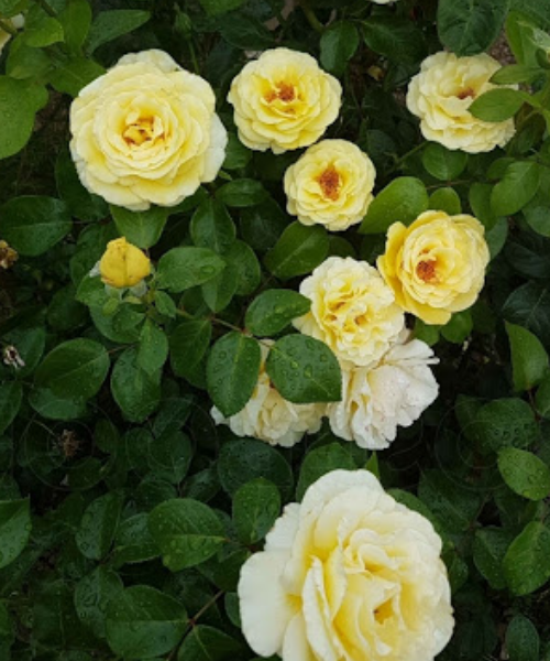 The flowers are large (8-10 cm in diameter), creamy yellow, double, with a light aroma. Bush height 0.70-0.90 m. Leaves dark green, shiny, resistant to diseases. Blooms repeatedly.