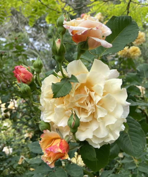 The flowers are caramel yellow, very full, frilly, with a light aroma. Blooms profusely. The height of the bush is about 1.3 m.