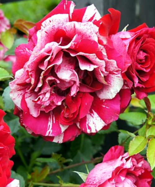 The flowers (7-10 cm in diameter) are red with pink stripes. The leaves are dark green, shiny. The bush is branched, with strong shoots, up to 1 m high. It blooms repeatedly.