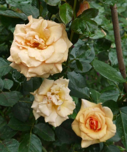 The flowers are medium to large, apricot in color, filled with a medium to strong aroma. The leaves are medium, shiny, dark green in color. The bush is upright, 1-1.5 m high, about 0.6 m wide.