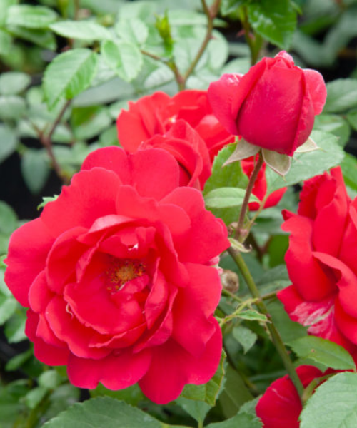 The flowers are bright red (7-8 cm in diameter), with a delicate aroma. The flowers are arranged in inflorescences of 3-5. The bush is up to 3 m high. It blooms repeatedly until autumn.