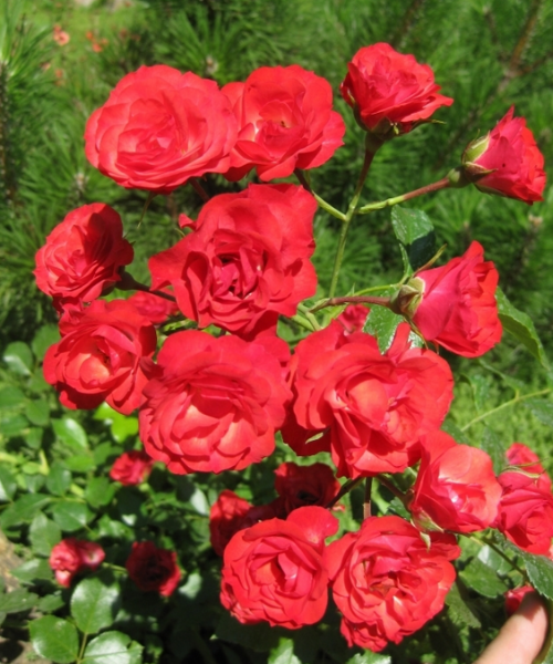 The flowers are red (3-4 cm in diameter), medium-full. The flowers are arranged in inflorescences of 5-10. The flowers last a long time and do not fall off. The leaves are small, shiny. The bush is widely spread, height up to 0.9-1 m, width 1-1.6 m. Blooms repeatedly until frost. Good winter hardiness.