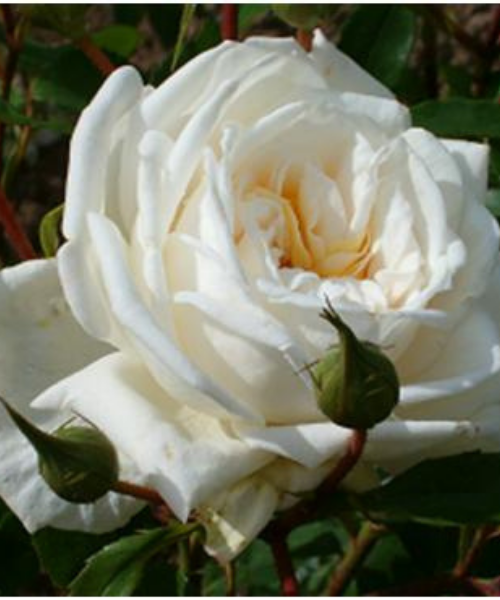 The flowers are white, double. The height of the bush is up to 0.8 m. It blooms repeatedly.