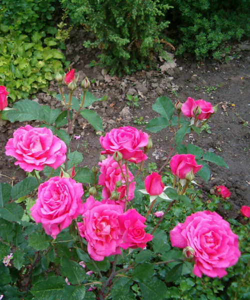 The flowers are purple-red in color. They bloom profusely.